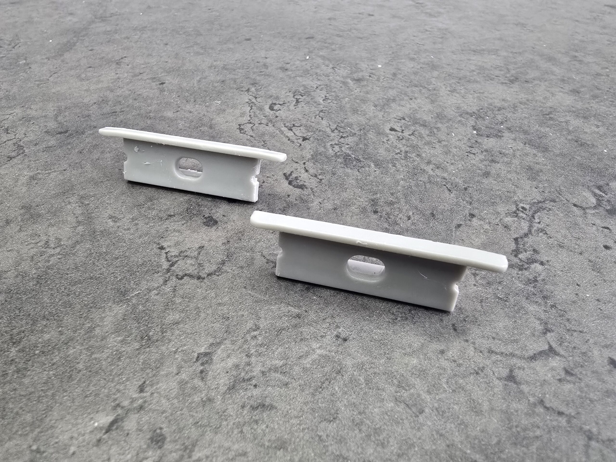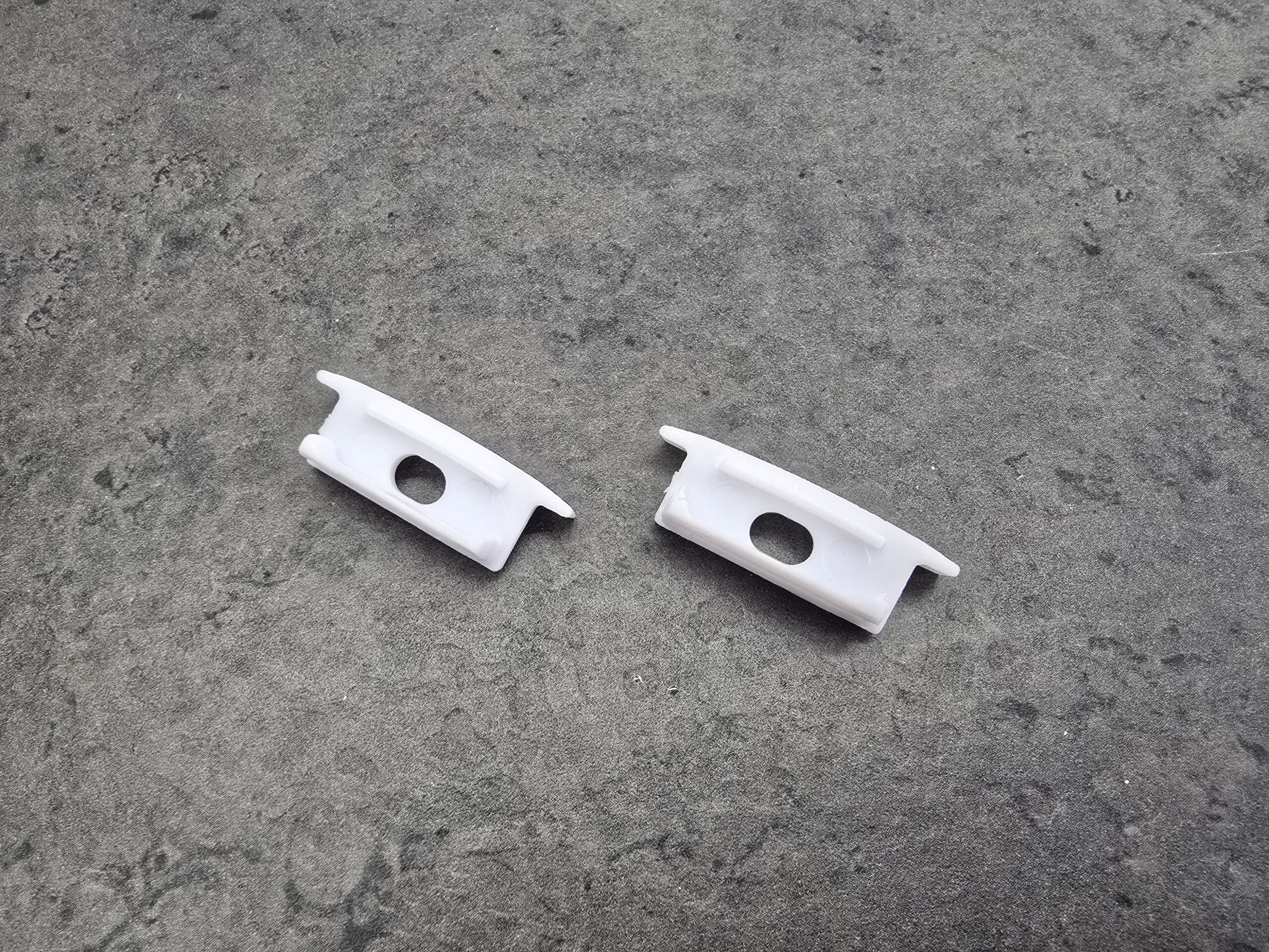 Recessed End Caps are sold in pairs, and both are supplied with a pre-drilled hole for cable management. These caps are specifically shaped to close the ends of LED channels sunk into a surface. The dual-holed packaging ensures flexibility in feeding the power cable through and facilitating fully hidden wiring. They maintain the sleek, flush-mounted appearance while sealing the channel against dust and debris.
